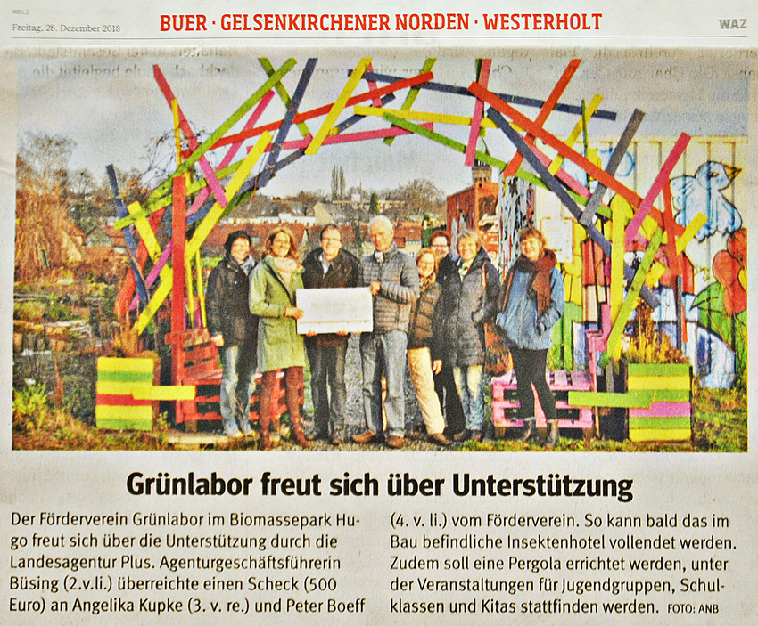 Der Förderverein Grünlabor im Biomassepark Hugo bedankt sich herzlich für eine großzügige Spende, die er von der "Landschaftsagentur Plus" am 12. Dezember 2018 erhielt.